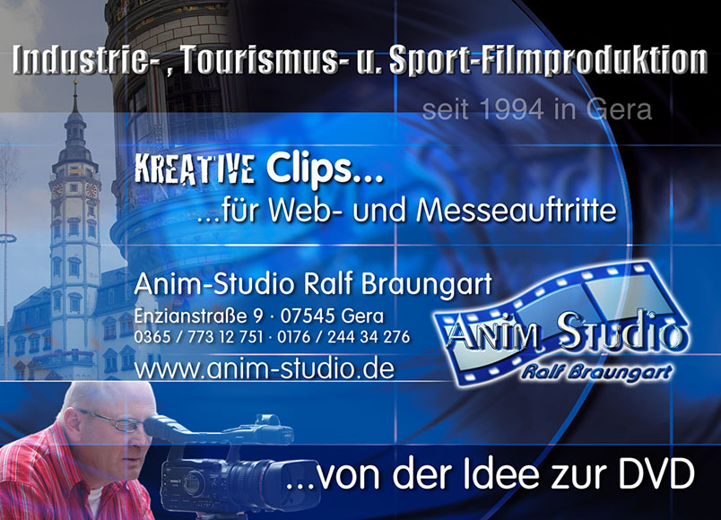 Willkommen beim Anim-Studio Ralf BraungartStudio für professionelle Video- & DVD-Produktion. Filmproduktion für Industrie, Tourismus, Kultur und Sport. Schulungen für Final Cut, Photoshop und Quark Express. Kreative Gestaltung von Druckerzeugnissen. Autorisierter Fachhändler für „Macro System”.